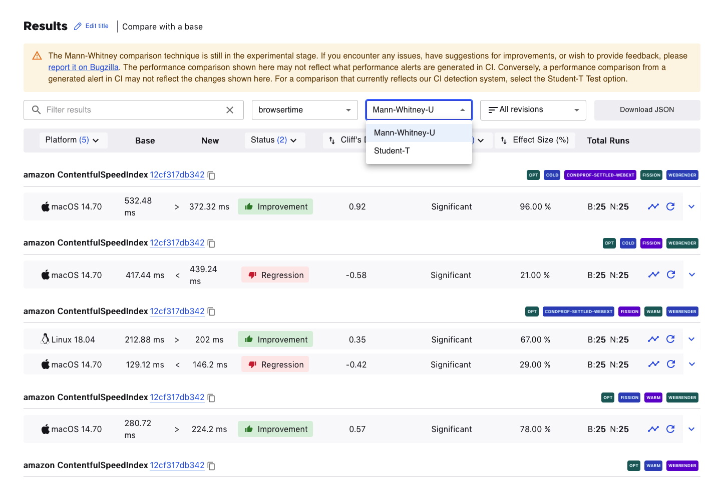 The default statistical technique for PerfCompare is Mann-Whitney-U, recently changed from Student-T, which is still available for selection in the test version dropdown. Student-T will be removed from the platform in the coming year.