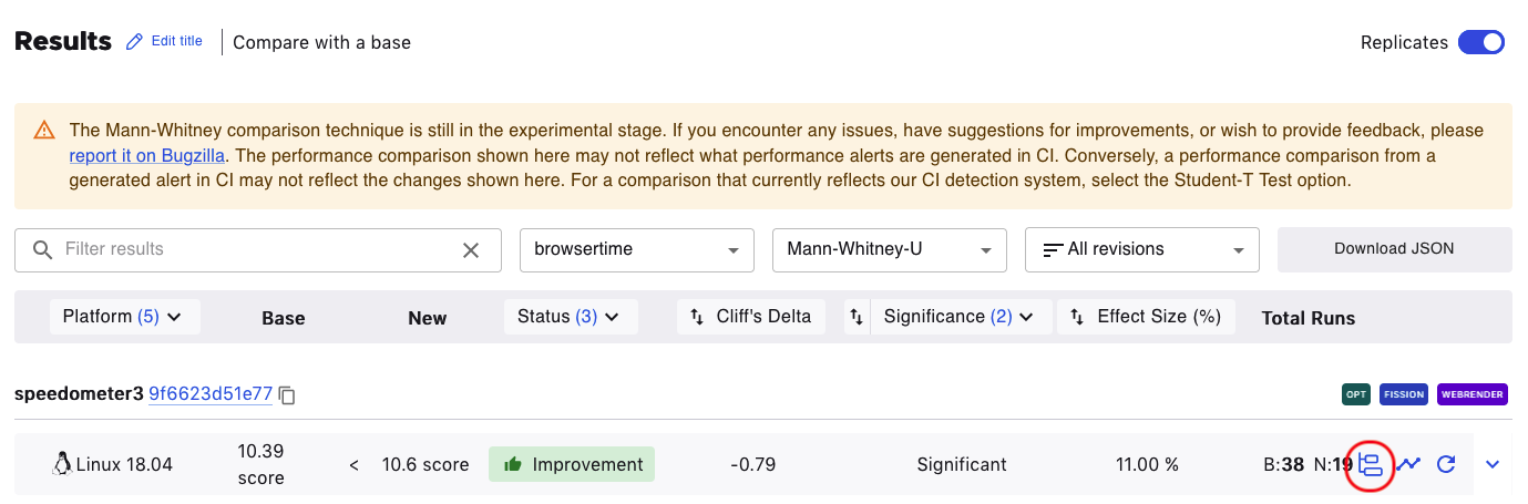 The results table can be filtered according to Platforms, Status (No Changes, Improvement, or Regression), or Confidence (Low, Medium, High).